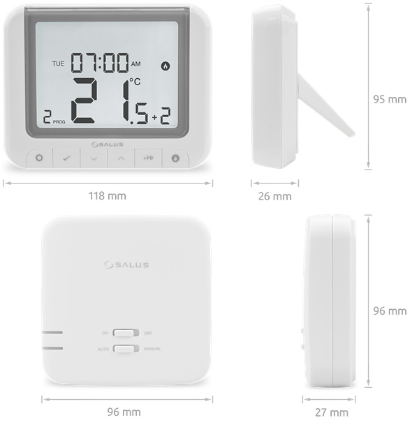 | Dimensiuni LxlxG (mm) | 118 x 95 x 26 (termostat) 96 x 96 x 27 (receptor) |